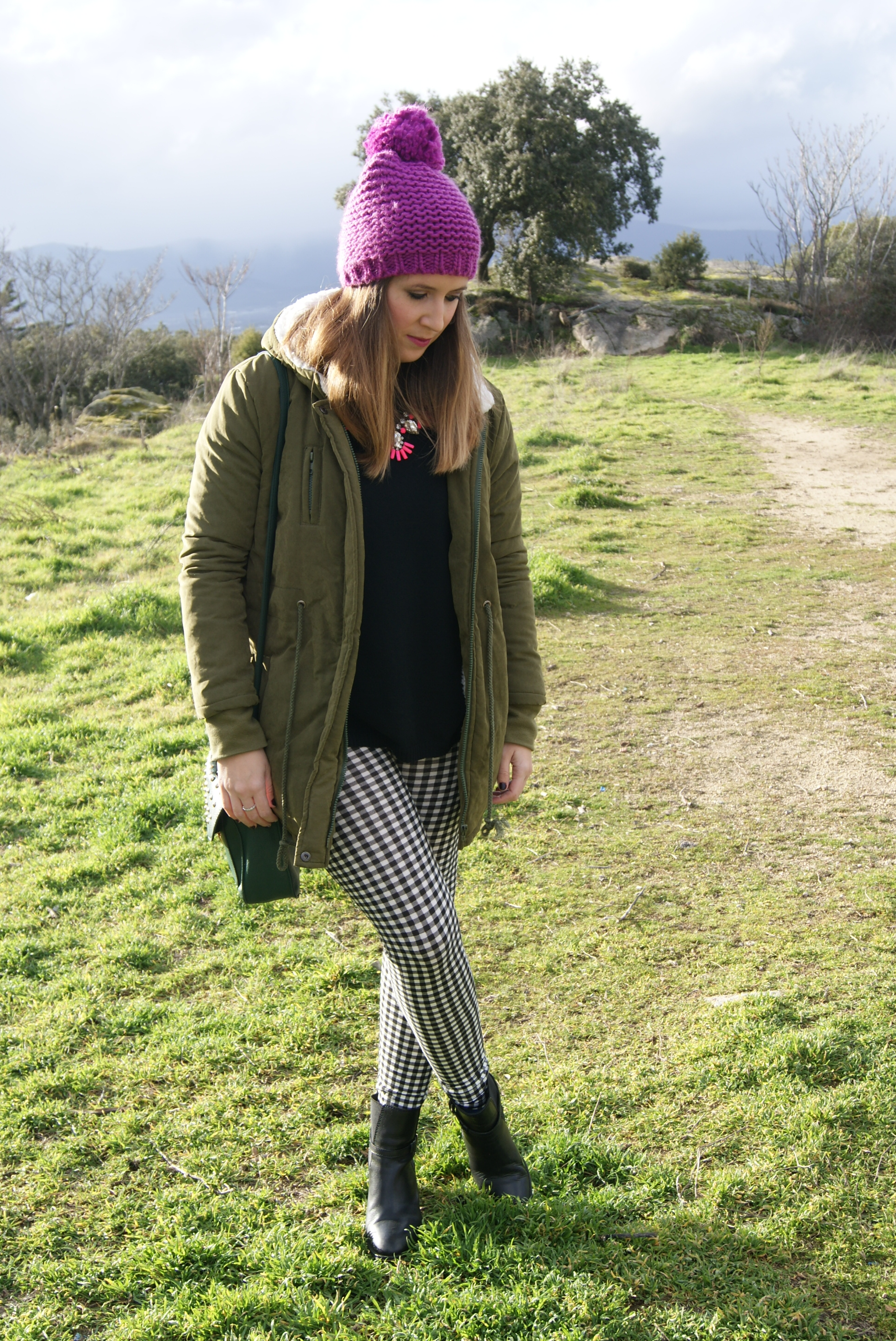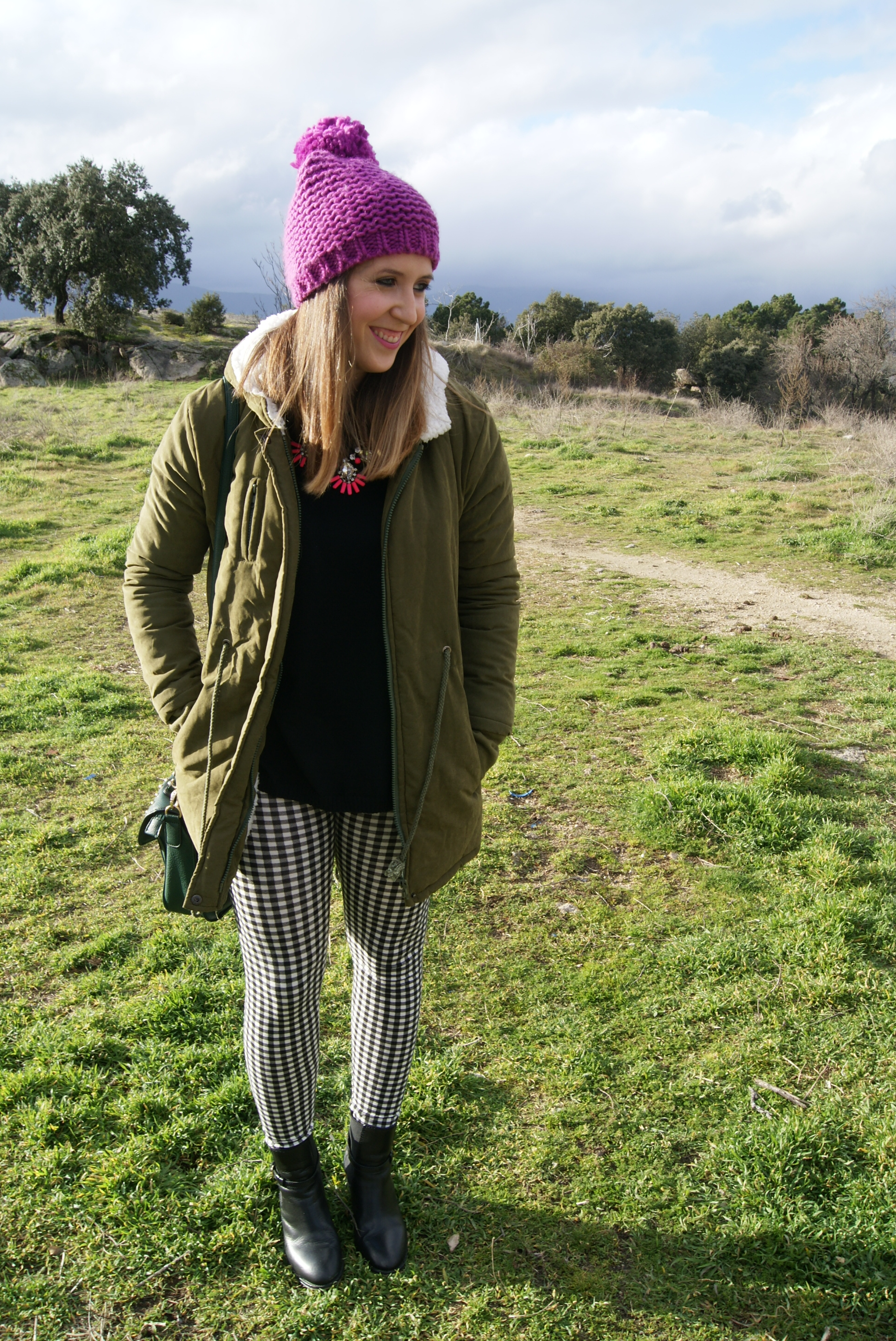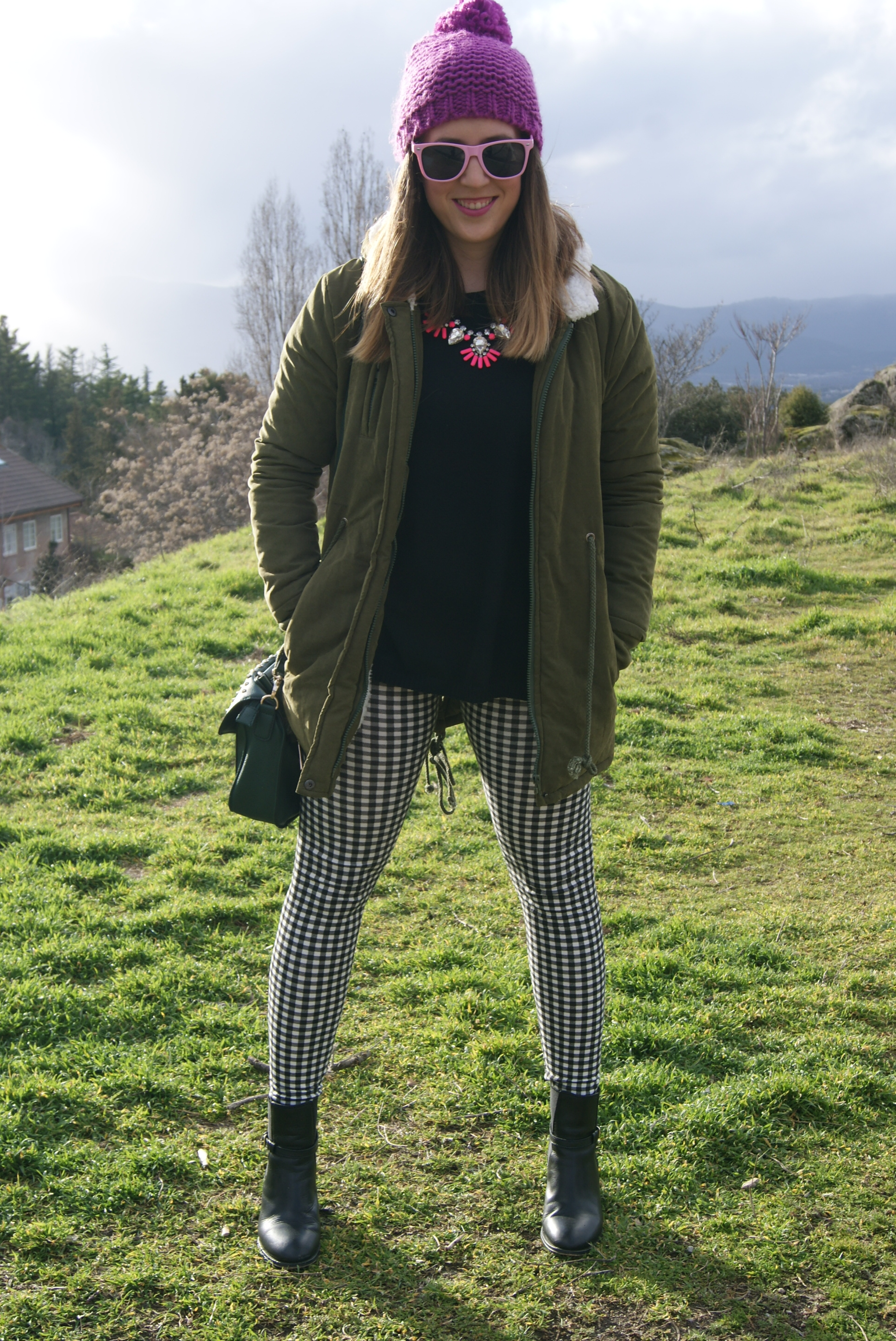 El look casual que os propongo hoy está formado por unos leggings de pata de gallo que me encantan de Shana; jersey de Pull&Bear que a parte de super bonito es comodísimo; parka de Sammy Dress que ya os enseñé en otro look aquí; botines de Zara; gorrito en tono orquídea radiante de Primark que también pudisteis ver aquí; bolso de tienda local que la da un punto rockero que me encanta; collar de Lovelix que es amor no, lo siguiente y las preciosas y solidarias gafas de AECC.