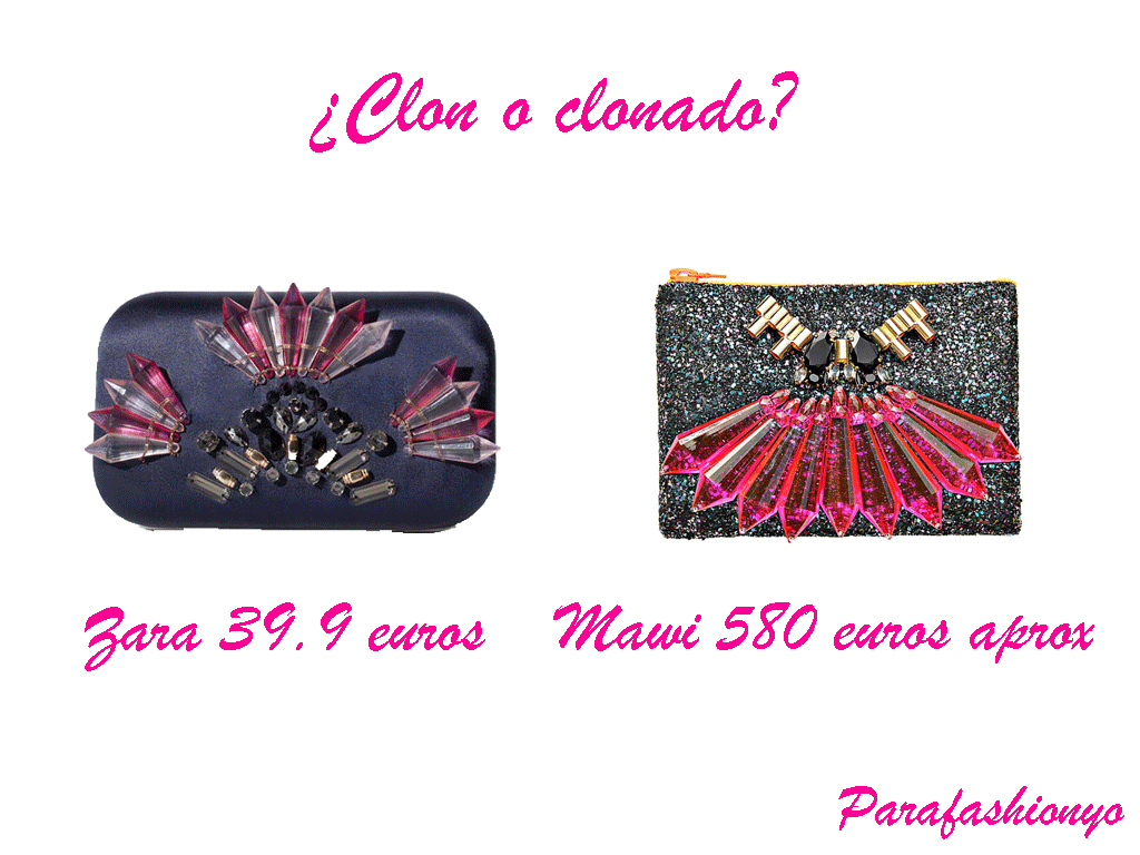 Hola a tod@s!!! Ánimo chic@s que ya estamos en el ecuador de la semana. Yo estoy especialmente contenta porque hoy es mi cumpleaños y me caen 31 primaveras así que me tomaré un trocito de tarta por vosotr@s 😉 No sé si os pasará como a mi, pero yo disfruto como una enana cumpliendo años. Y con lo que también me lo paso pipa es localizando clones de moda como el que os propongo esta semana. Ya os dije el lunes que los diseños de Mawi estaban arrasando y que no era raro que pronto comenzásemos a ver clones suyos. Pues bien, hoy quier compartir con vosotr@s el clon que ha creado Zara de uno de los clutches con cristales de Swarovski de Mawi. A ver qué os parece.