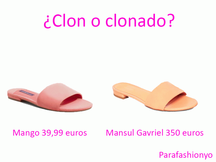 Esta semana entre clon y clonado existen 3 diferencias. La primera de ellas está en el color que es obvio que no tiene nada que ver jiji. La segunda la encontramos en el tipo de piel que es distinta en Mansul Gavriel, con un acabado clásico mientras que en Mango es el clásico «piel vuelta» de toda la vida de dios jii. Y la tercer y última está como siempre en el precio. Las sandalias de Mansul Gavriel cuestan la friolera de 350 euros mientras que las de Mango cuestan 39,99 euros.