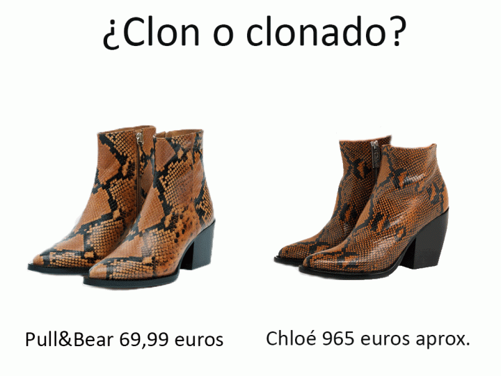 Las diferencias evidentes son: el estampado, el tacón y el precio. Y hay amigas el precio…. Las botas de Chloé cuestan nada más y nada menos que 965 euros aprox. y los de Pull&Bear 69,99 euros. De ahí que os dijese que low cost, low cost no es esta vez el clon. Llamadme rara pero yo casi 70 euros no los veo muy económicos sobre todo, para tratarse de un estilo de botín que hoy está de moda pero veremos a ver la próxima temporada ;).