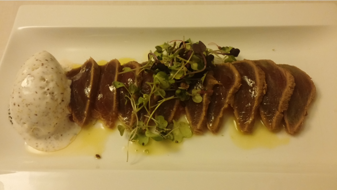Nosotros probamos tataki de atún con tartar de tomate y helado de mostaza a la antigua y pan tostado con tomate y aceite como entrantes para compartir. Como platos principales elegimos merluza y timbal de rabo de toro al chocolate con frutos silvestres y de postre para compartir tarta de queso souffle. Salimos rodando pero encantados de la vida porque cada cosa que probábamos superaba con creces a la anterior. Brutal todo!! Mirad que pintaza ;).