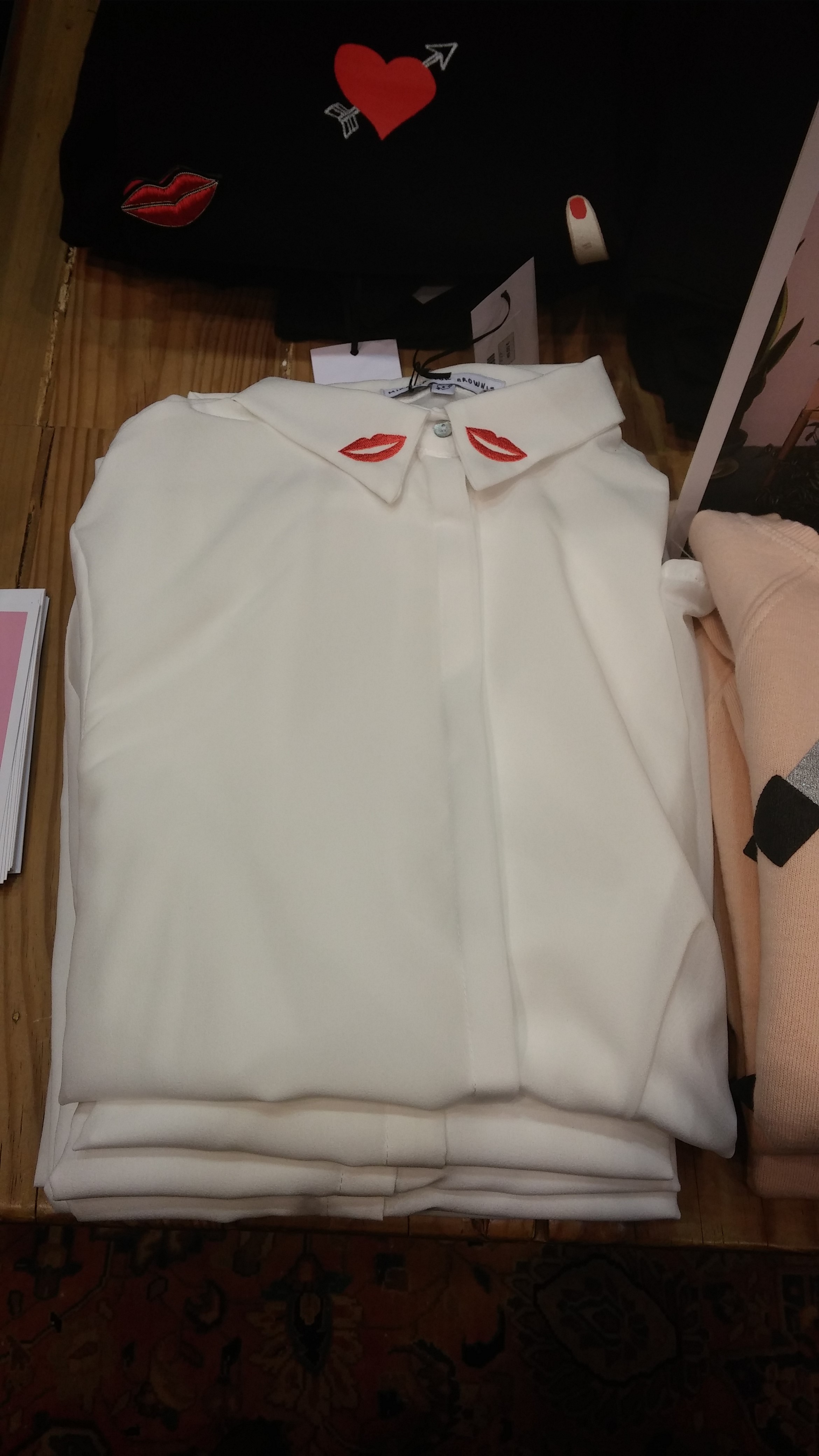 La colección está compuesta por 4 piezas, algunas de ellas en varios colores: una sudadera con dibujos super divertidos con formas de corazón, maquillaje y un ojo; una falda de corte skater negra con dibujos de labios en la parte inferior; una camisa a juego con la falda con labios en los cuellos y una camiseta muy sobria simplemente con el nombre de su diseñadora.