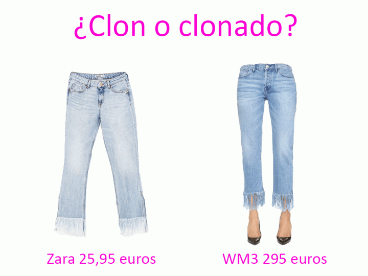Entre clon y clonado solo existen 4 diferencias. La primera de ellas está en el tono de los jeans que es más oscuro en WM3. La segunda la encontramos en los flecos, que no son del todo idénticos y que tienen una apertura lateral en Zara que no existe en los de MW3. La tercera es el tipo de vaquero que es recto en el caso de los jeans de WM3 y boyfriend los de Zara. Y la cuarta y última como siempre lo encontramos en el precio. Los de WM3 cuestan 295 euros en Amazon y los de Zara los encontramos por 25,95 euros.