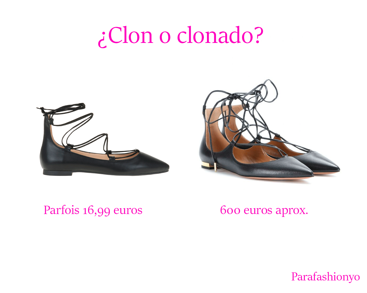 Esta semana entre clon y clonado existen 4 diferencias. La primera de ellas es el tacón. El de Aquazzura tiene un borde dorado y en cambio el de Parfois es completamente negro. La segunda es la longitud de los cordones que es mucho mayor en las bailarinas de Aquazzura. La tercera diferencia la econtramos en los amarres laterales de los cordones. Los de Parfois tienen unos extremos que no tienen las bailarinas de Aquazzura. Y la cuarta y última como siempre está en el precio. Las de Aquazzura tienen un precio que ronda los 600-700 euros y las de Parfois las encontramos por 16,99 euros.