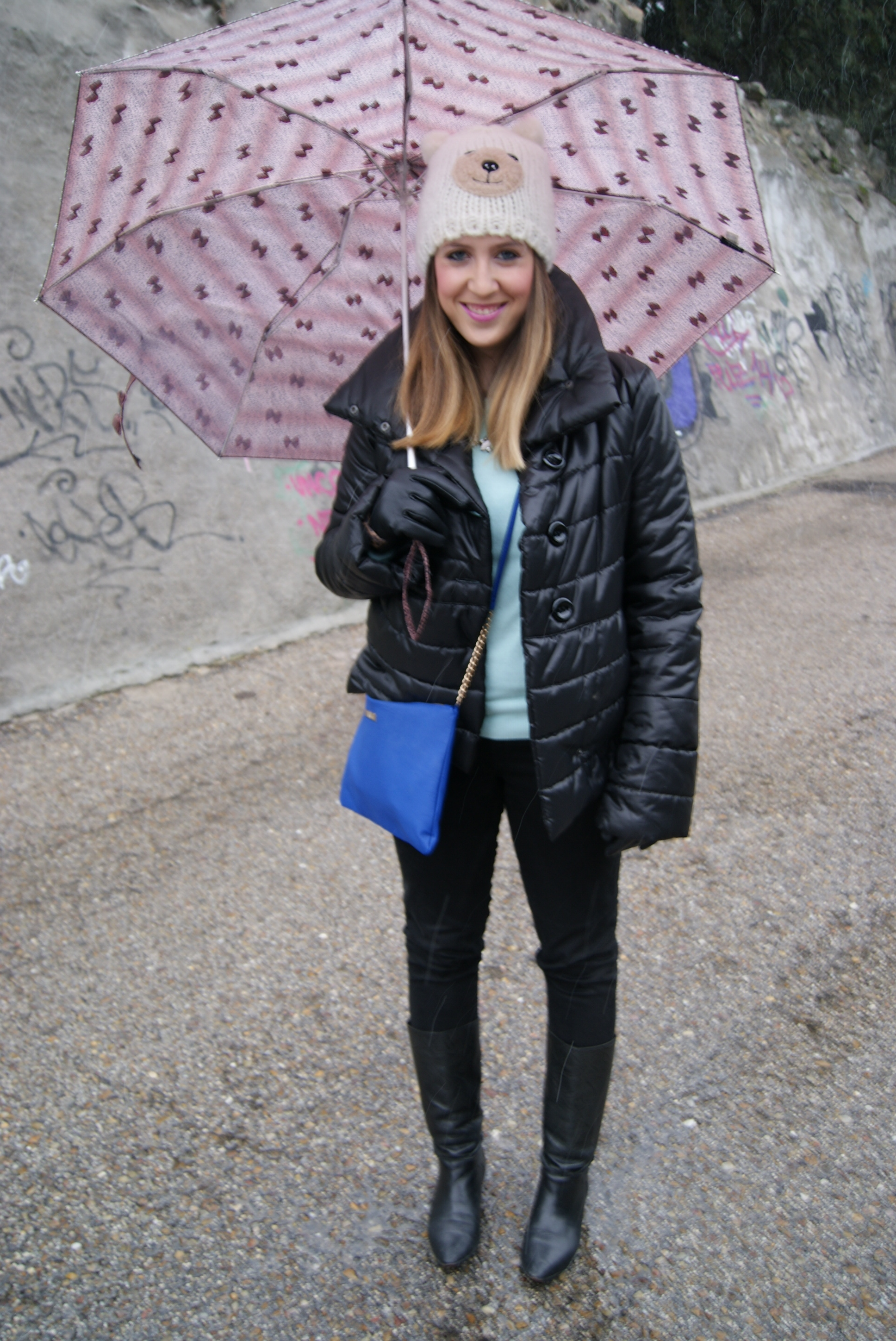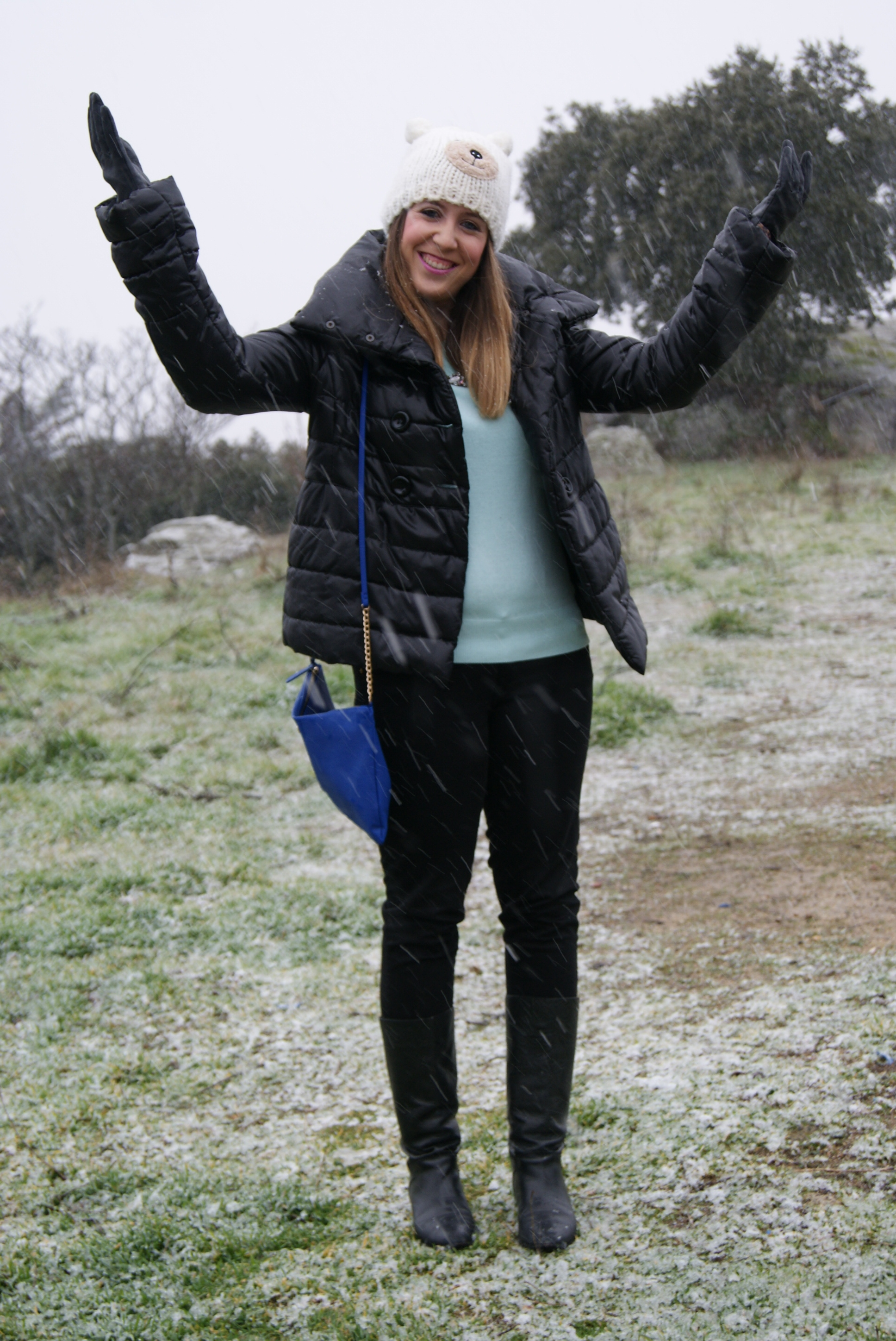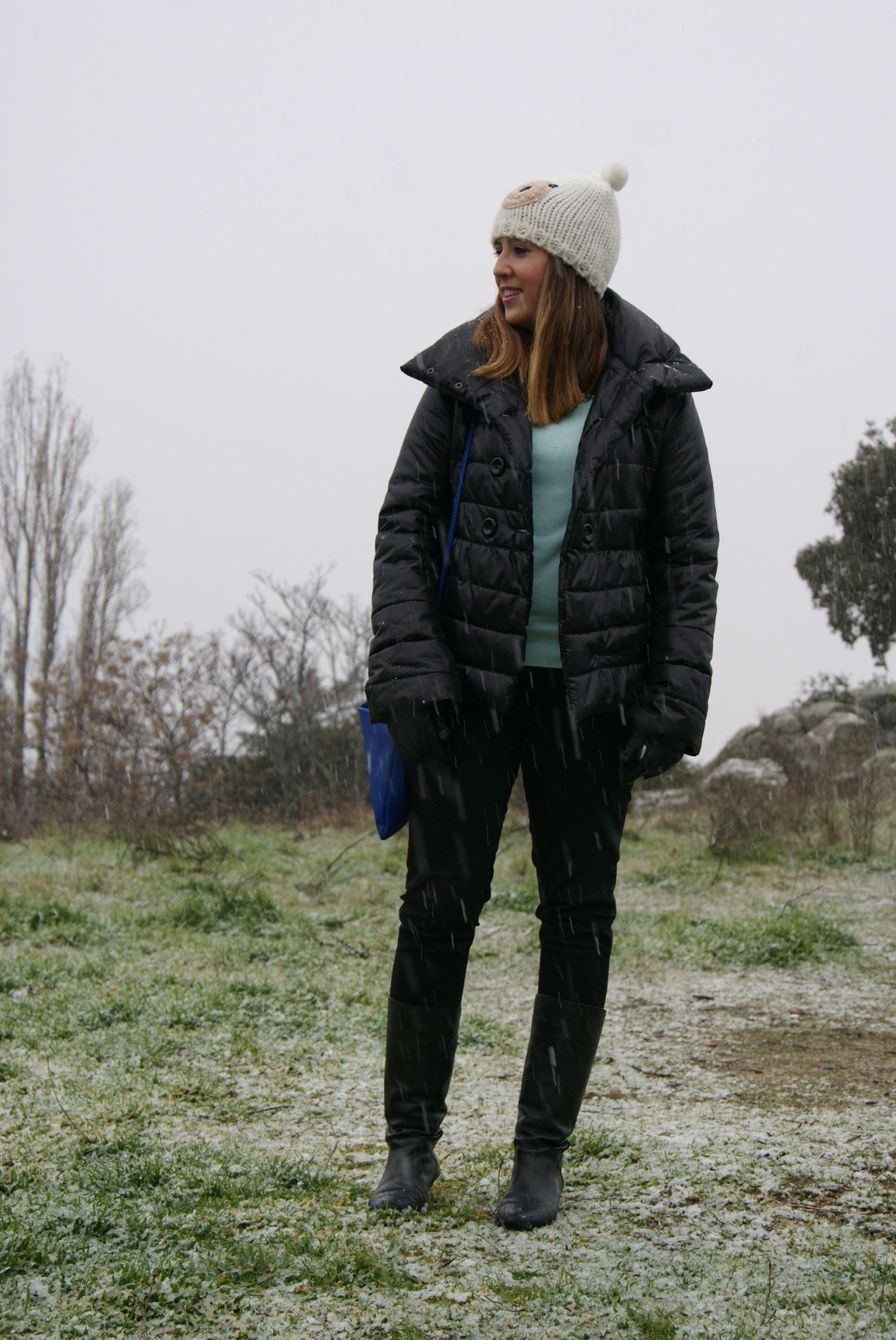 El outfit que escogí para un día en el que no paraba de nevar está compuesto por: plumas negro cortito y super calentito de una tienda local, jersey mint de Primark de nueva temporada, jeans negros de Lefties, collar joya también de Lefties de nueva temporada, gorrito de osito de Primark de la temporada pasada, bolso azul klein también de Primark pero de esta temporada, botas de una tienda local, reloj Marea, pulsera cruciani y guantes y paraguas de Suite Blanco.