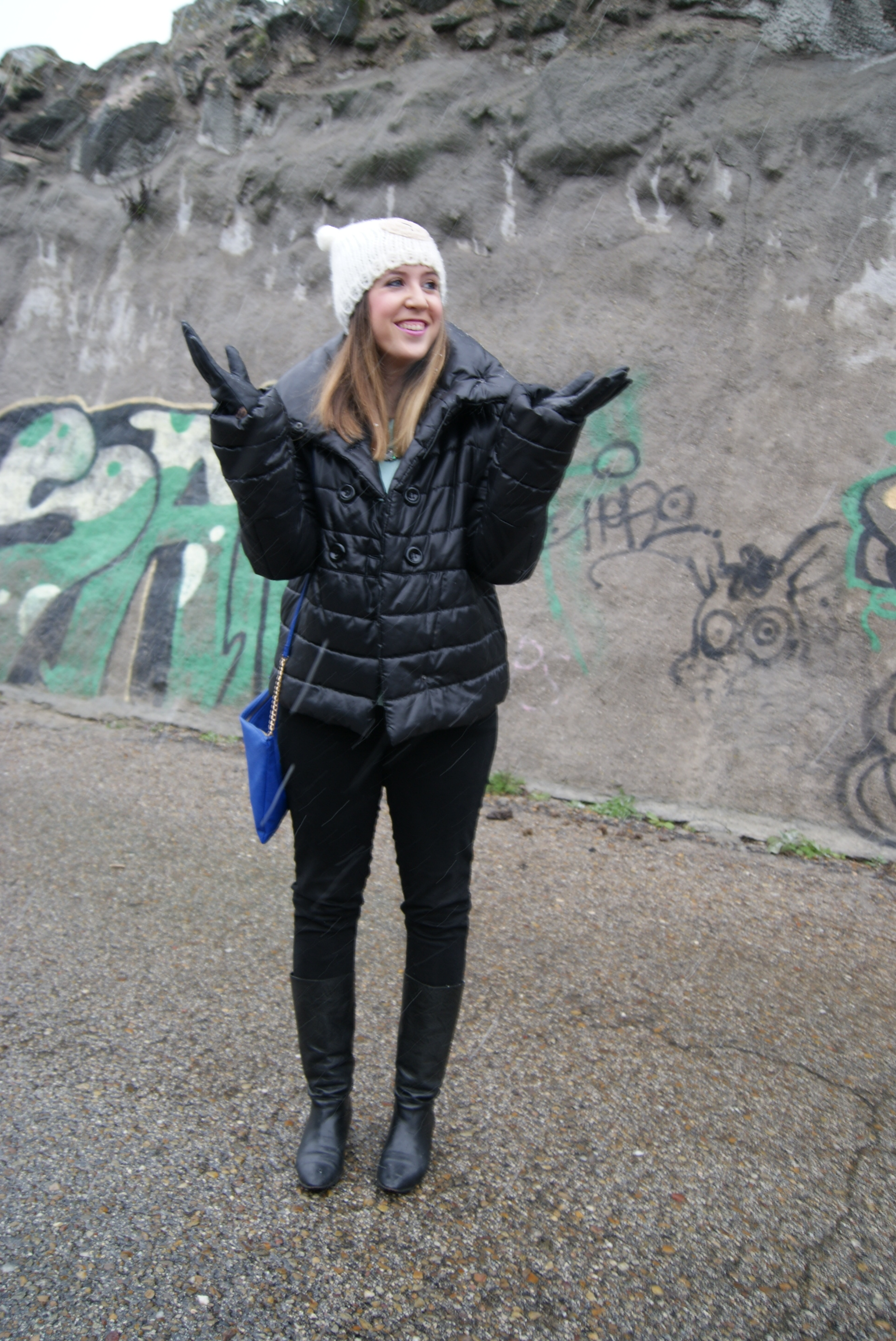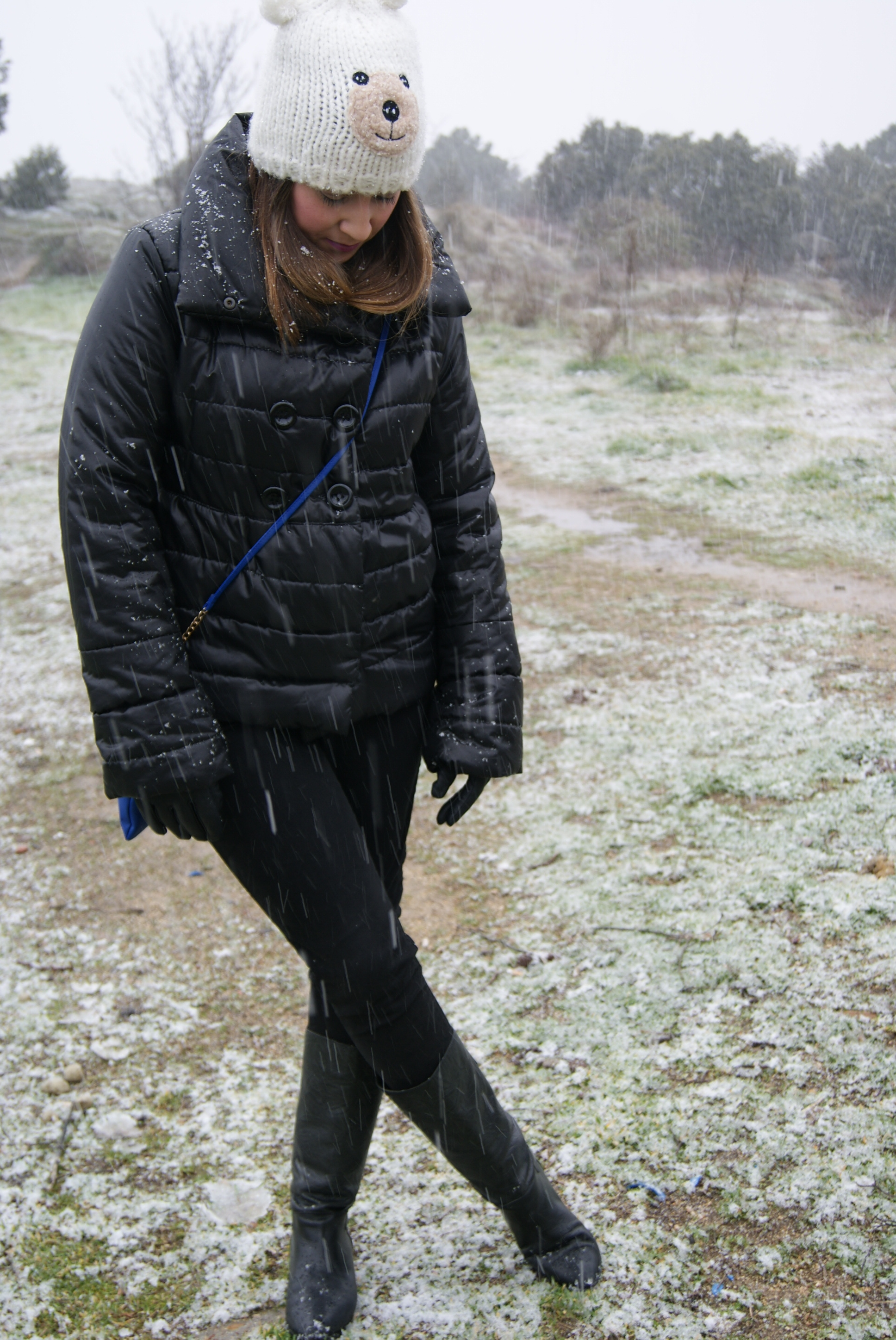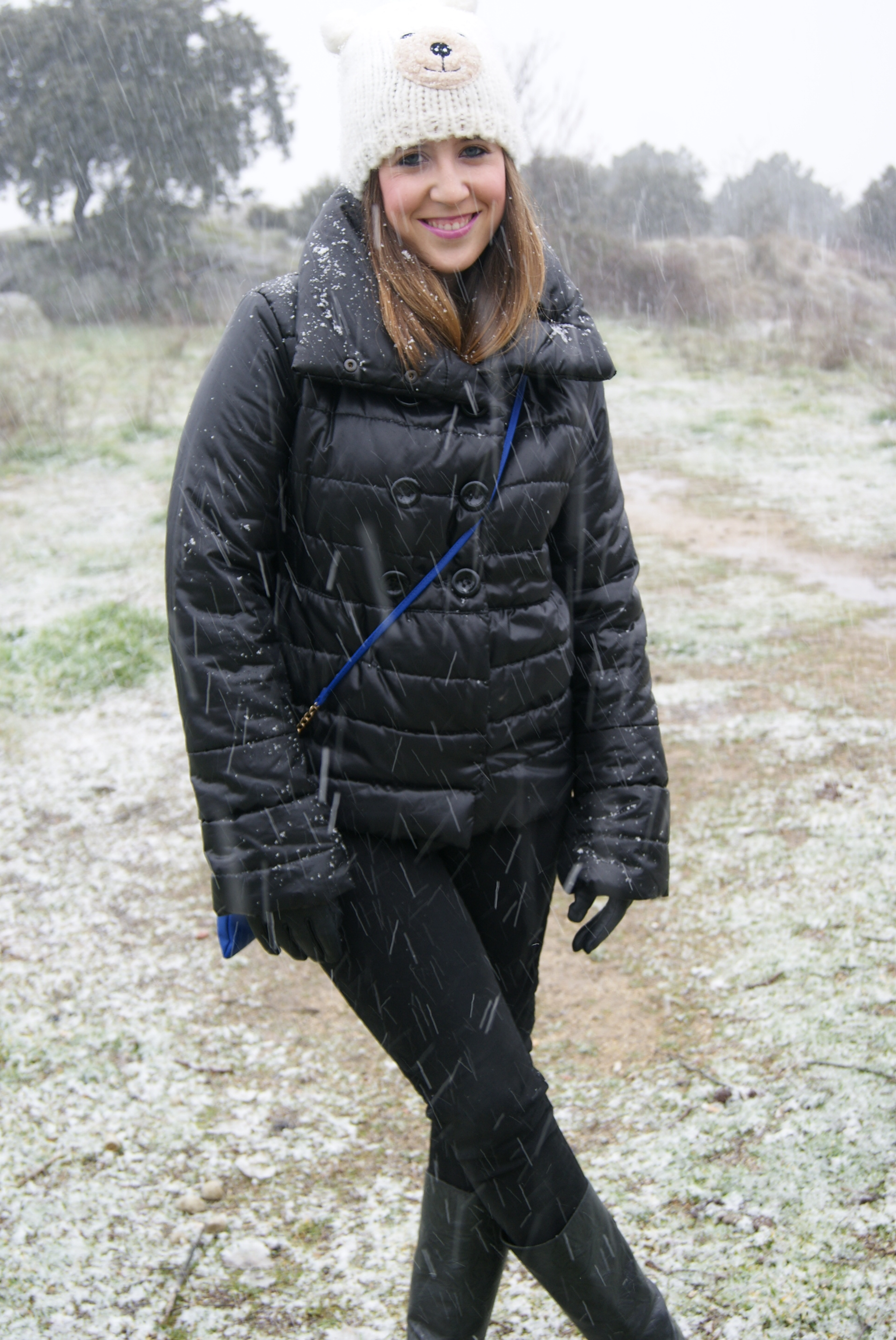 El outfit que escogí para un día en el que no paraba de nevar está compuesto por: plumas negro cortito y super calentito de una tienda local, jersey mint de Primark de nueva temporada, jeans negros de Lefties, collar joya también de Lefties de nueva temporada, gorrito de osito de Primark de la temporada pasada, bolso azul klein también de Primark pero de esta temporada, botas de una tienda local, reloj Marea, pulsera cruciani y guantes y paraguas de Suite Blanco.